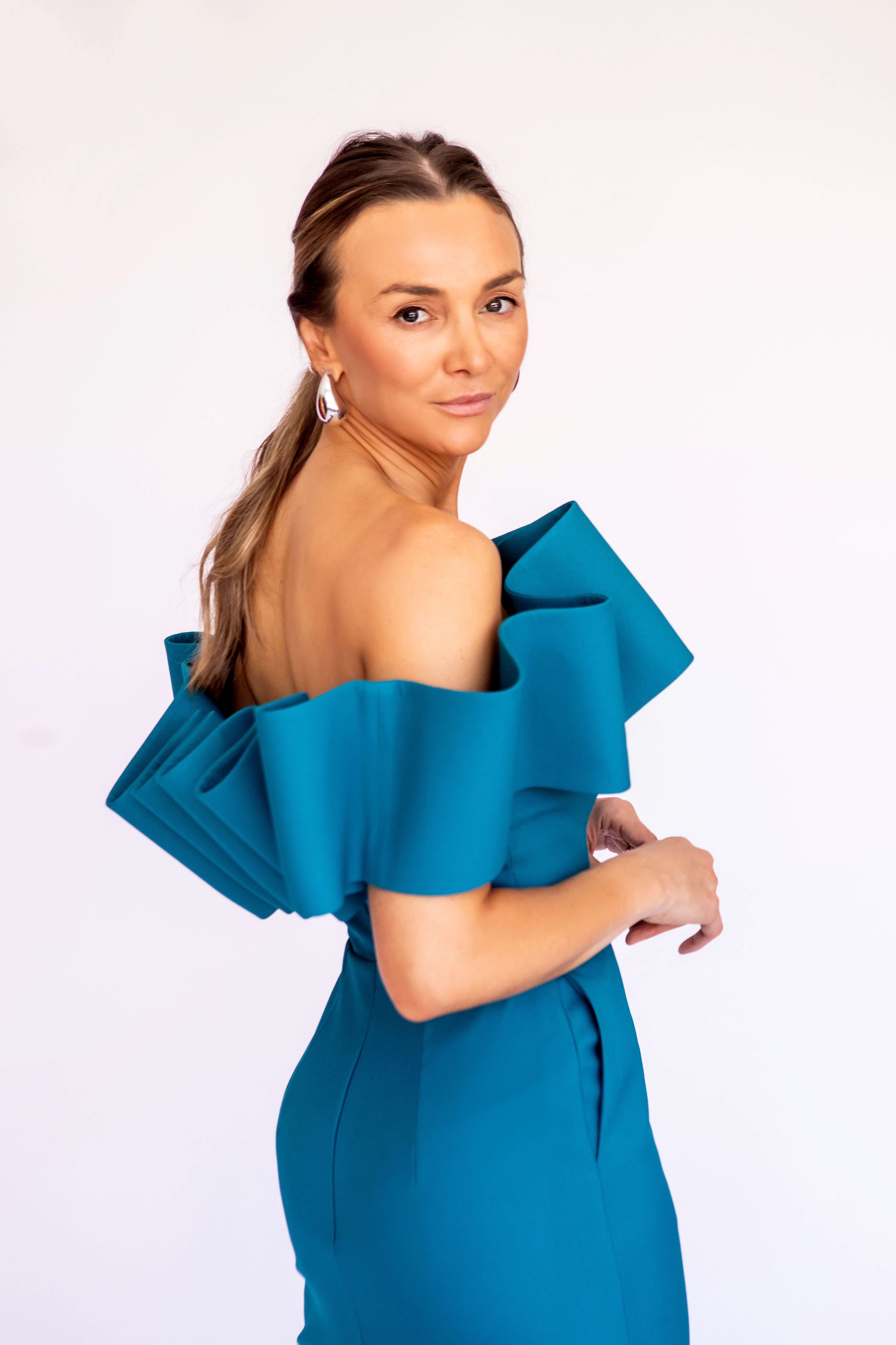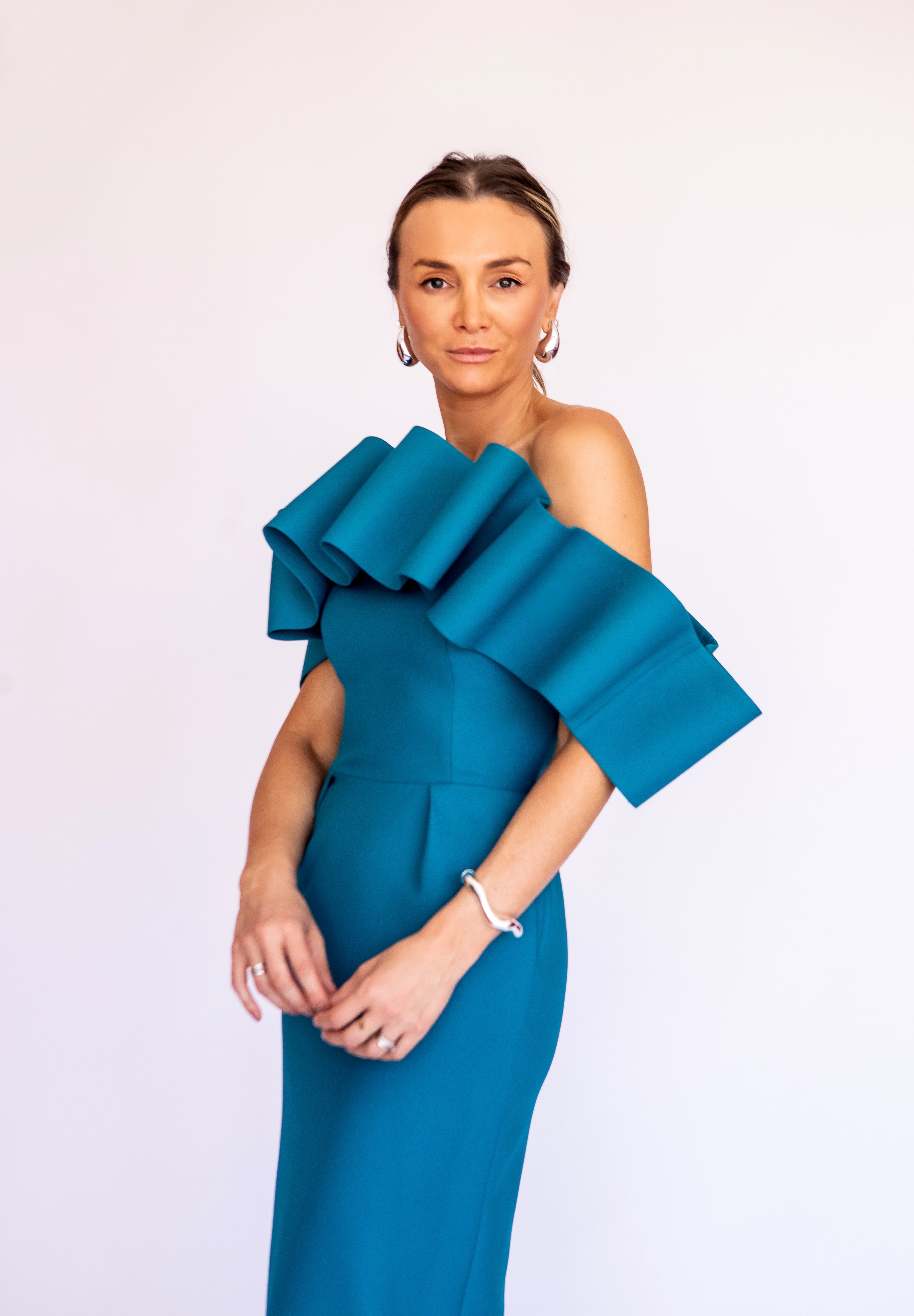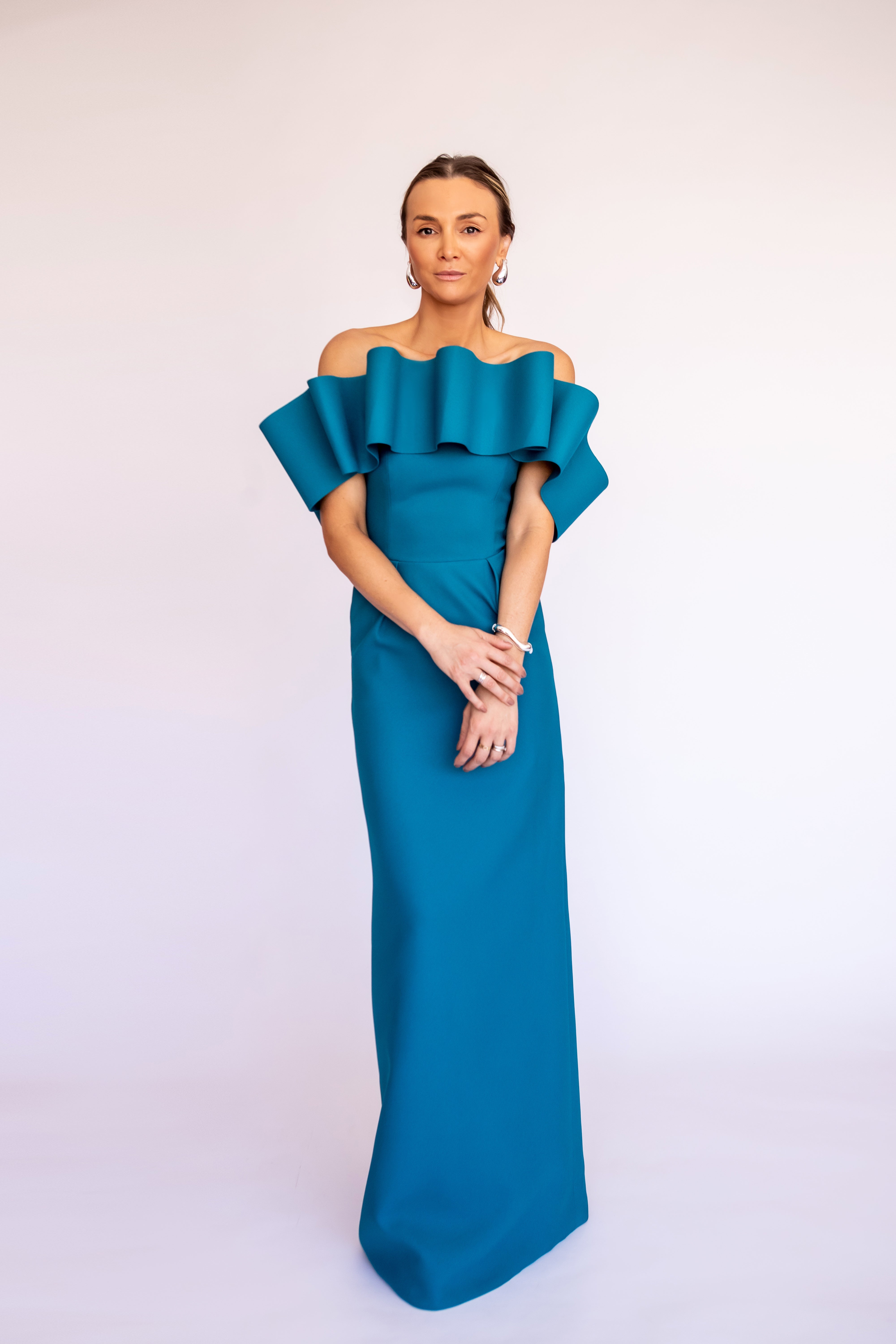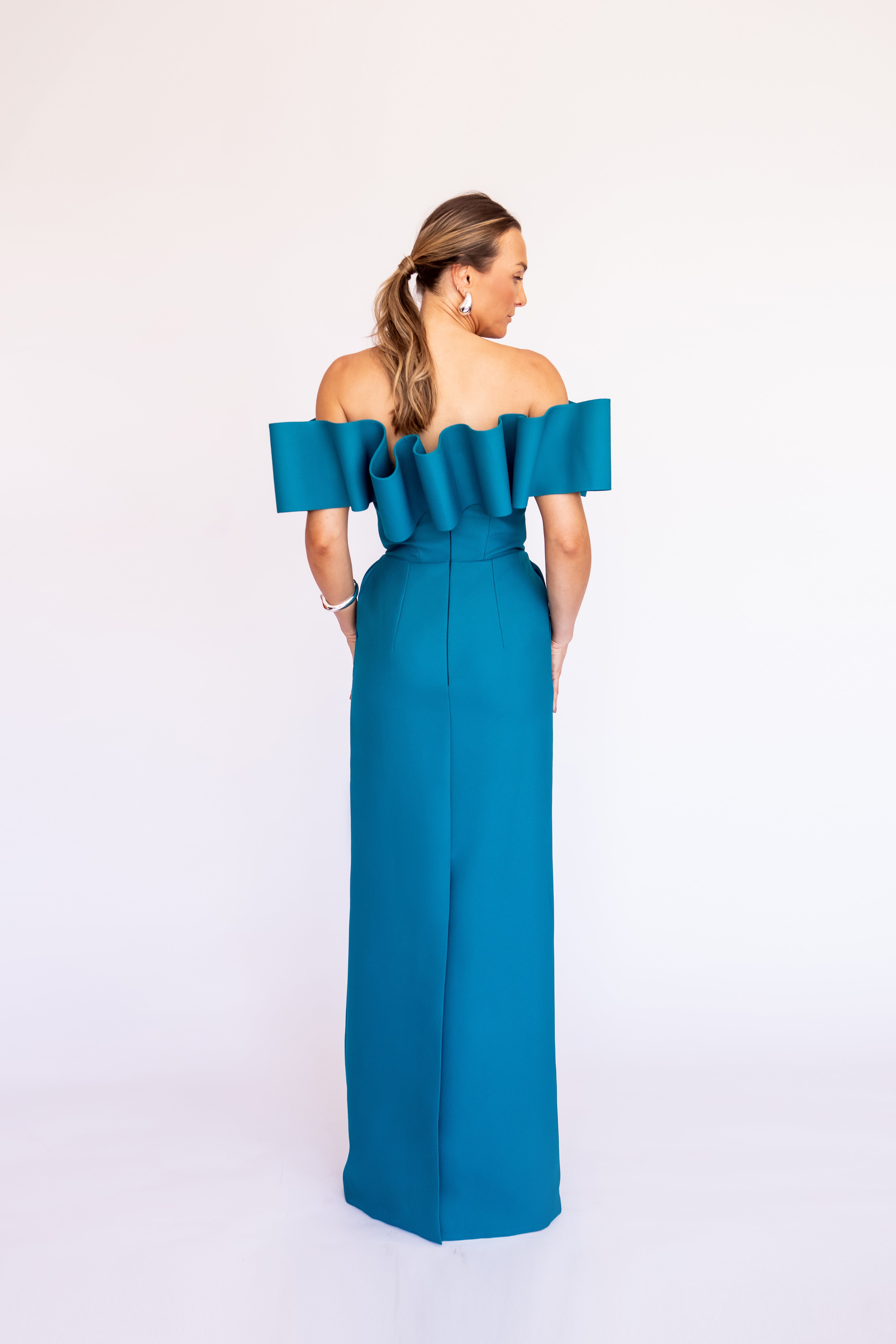 O grande diferencial está no detalhe de ondas esculturais que formam o decote ombro a ombro: um trabalho artístico que transforma o vestido em uma peça de impacto. E o melhor? As ondas são removíveis. Assim, você tem dois vestidos em um: um look dramático e protagonista com o detalhe aplicado, e um tubinho longo minimalista — perfeito para momentos mais discretos, jantares, formaturas ou eventos em sequência.