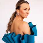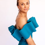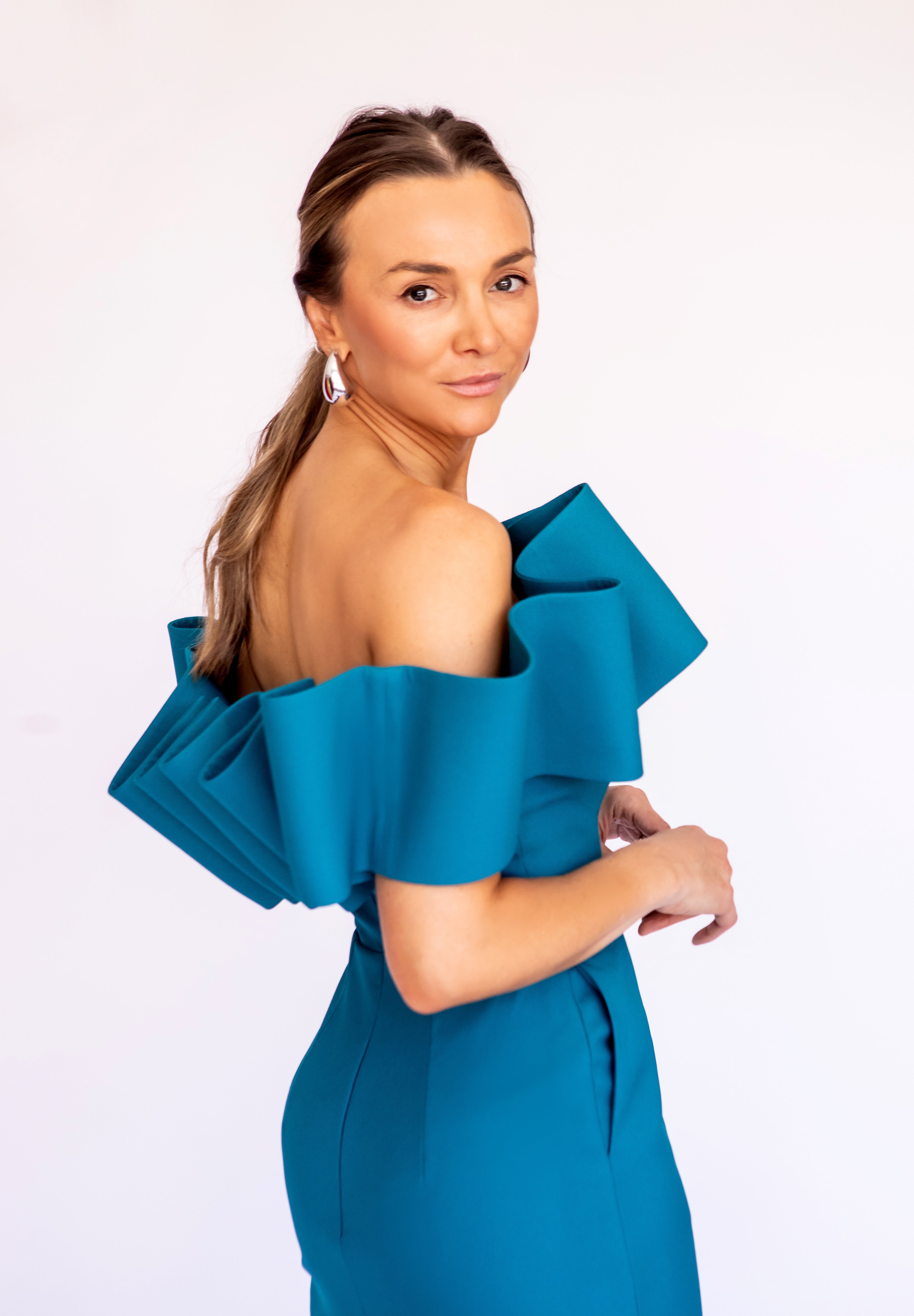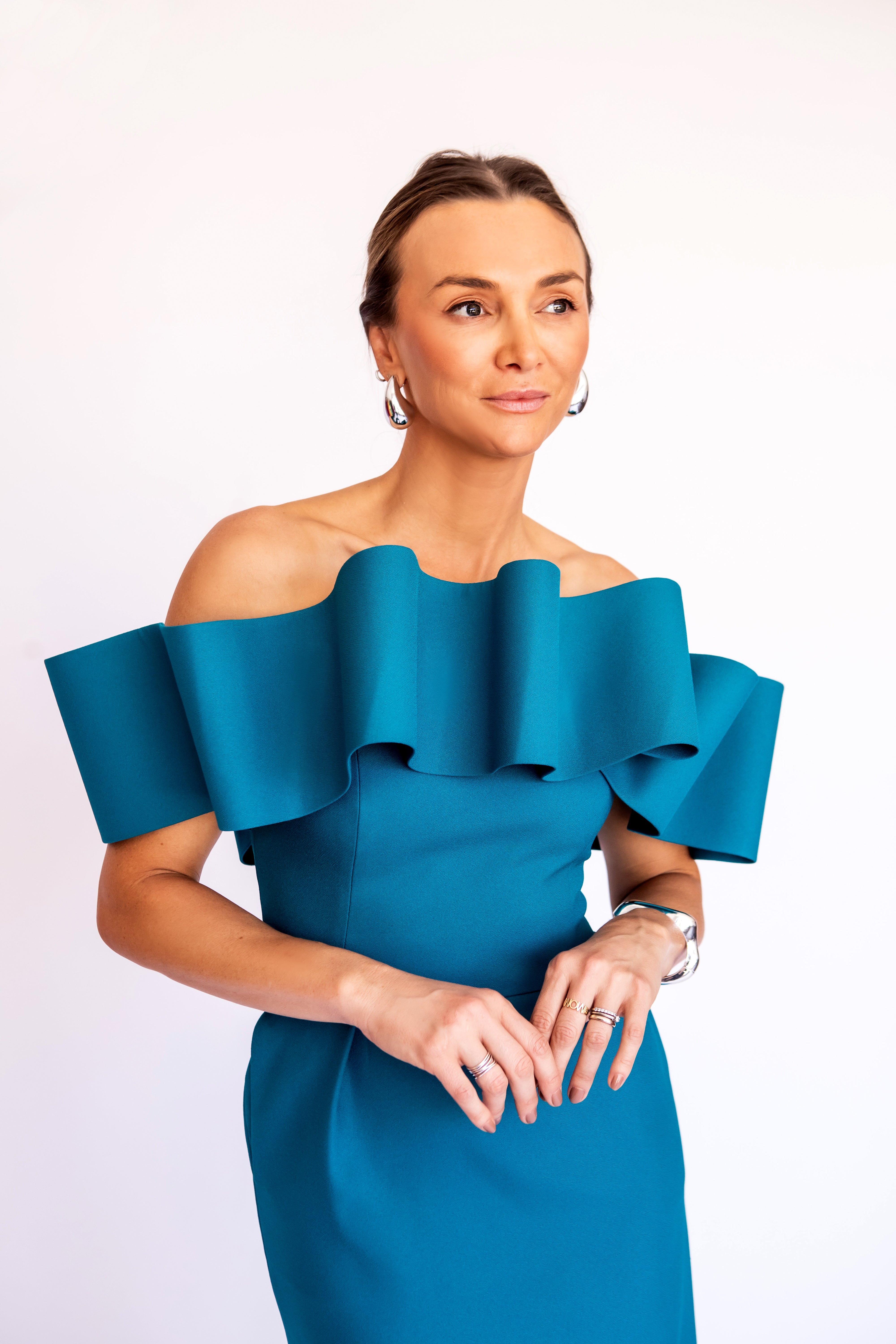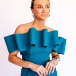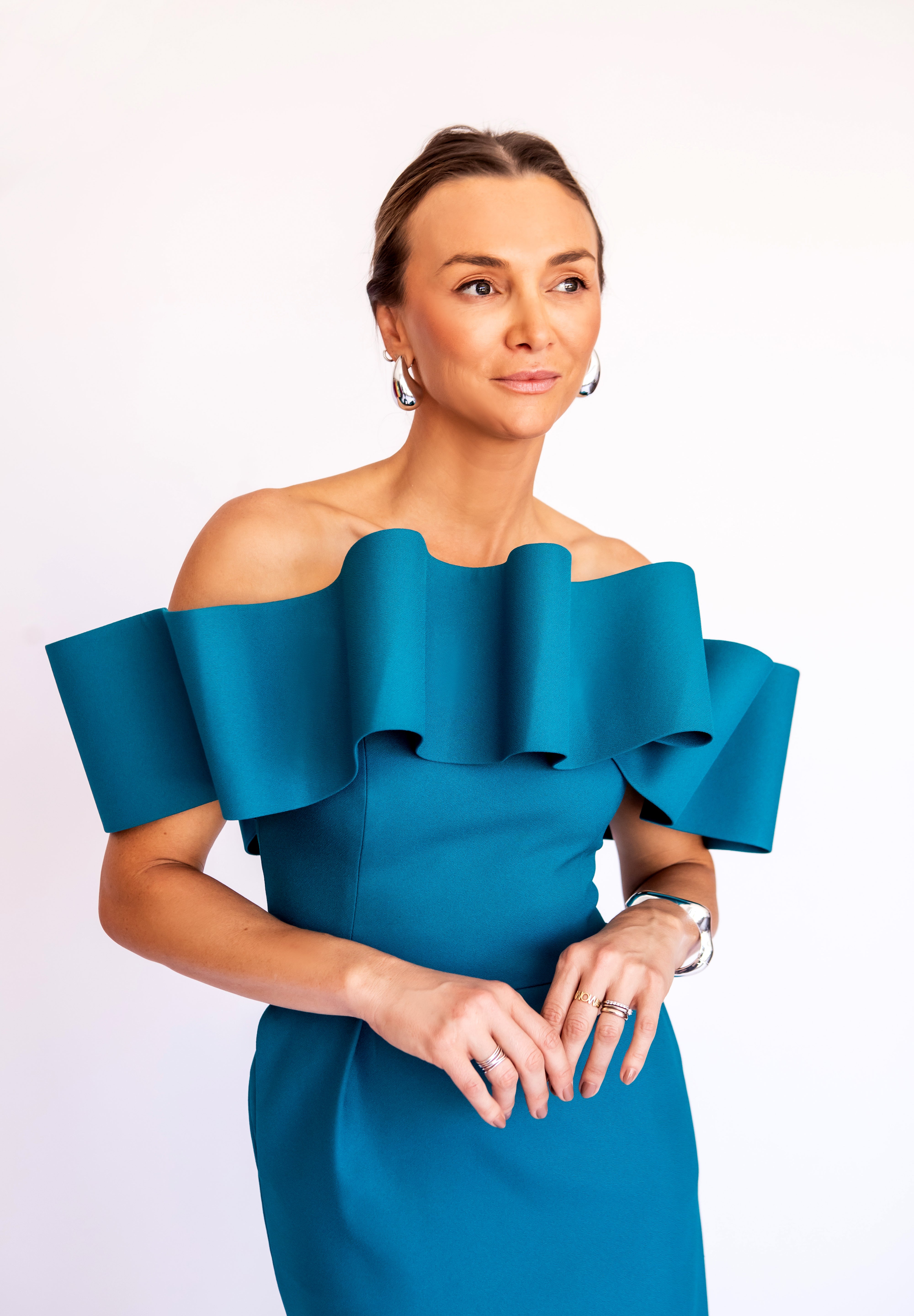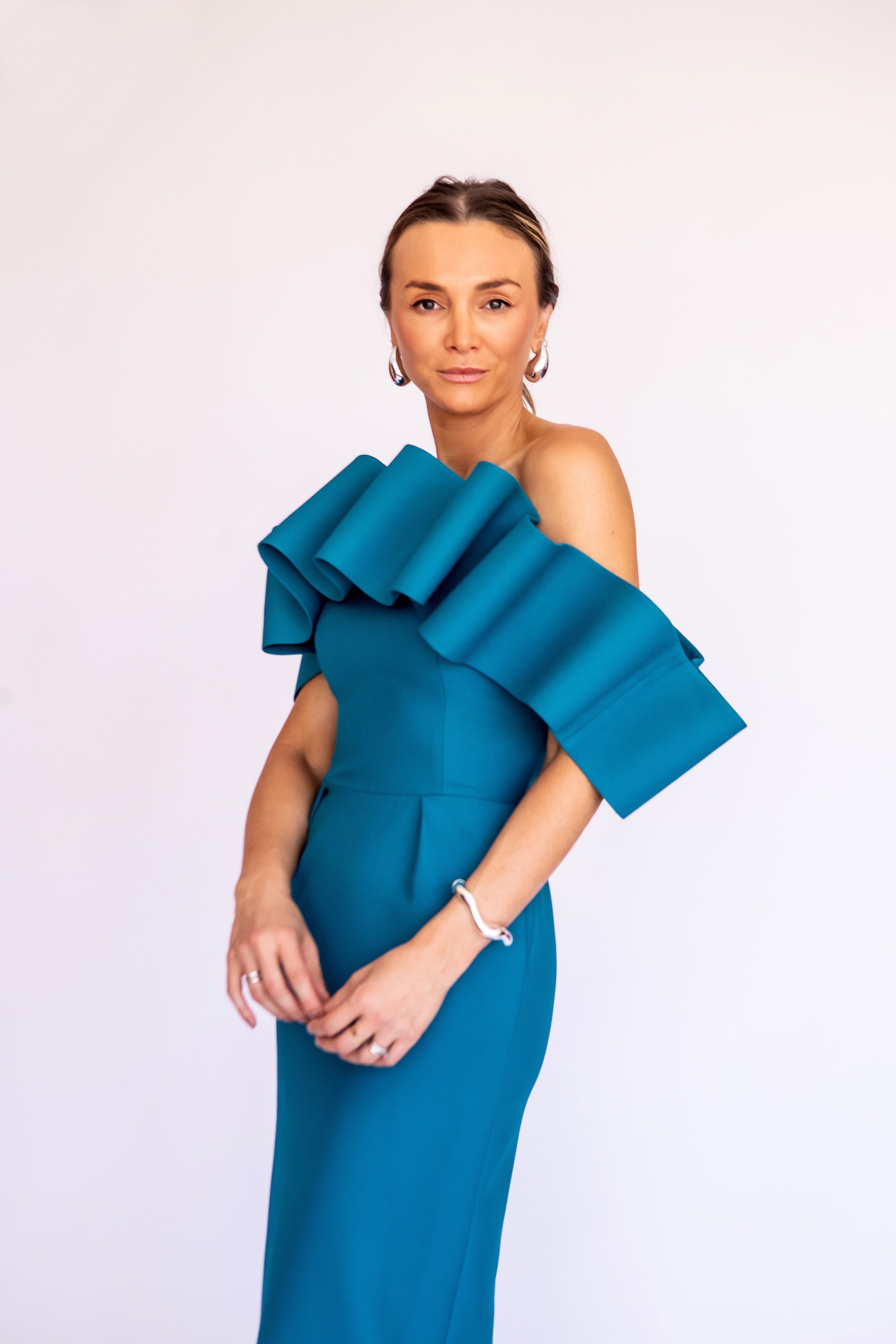 O grande diferencial está no detalhe de ondas esculturais que formam o decote ombro a ombro: um trabalho artístico que transforma o vestido em uma peça de impacto. E o melhor? As ondas são removíveis. Assim, você tem dois vestidos em um: um look dramático e protagonista com o detalhe aplicado, e um tubinho longo minimalista — perfeito para momentos mais discretos, jantares, formaturas ou eventos em sequência.